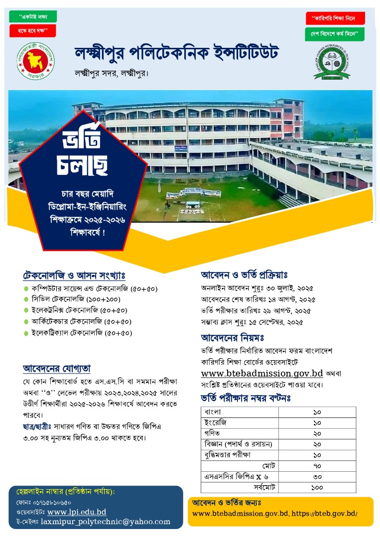 লক্ষ্মীপুর পলিটেকনিক ইন্সটিটিউটে ডিপ্লোমা ইন ইঞ্জিনিয়ারিং এ বিভিন্ন টেকনোলজিতে অনলাইন ভর্তির আবেদন ৩০.০৭.২৫ থেকে শুরু হবে।